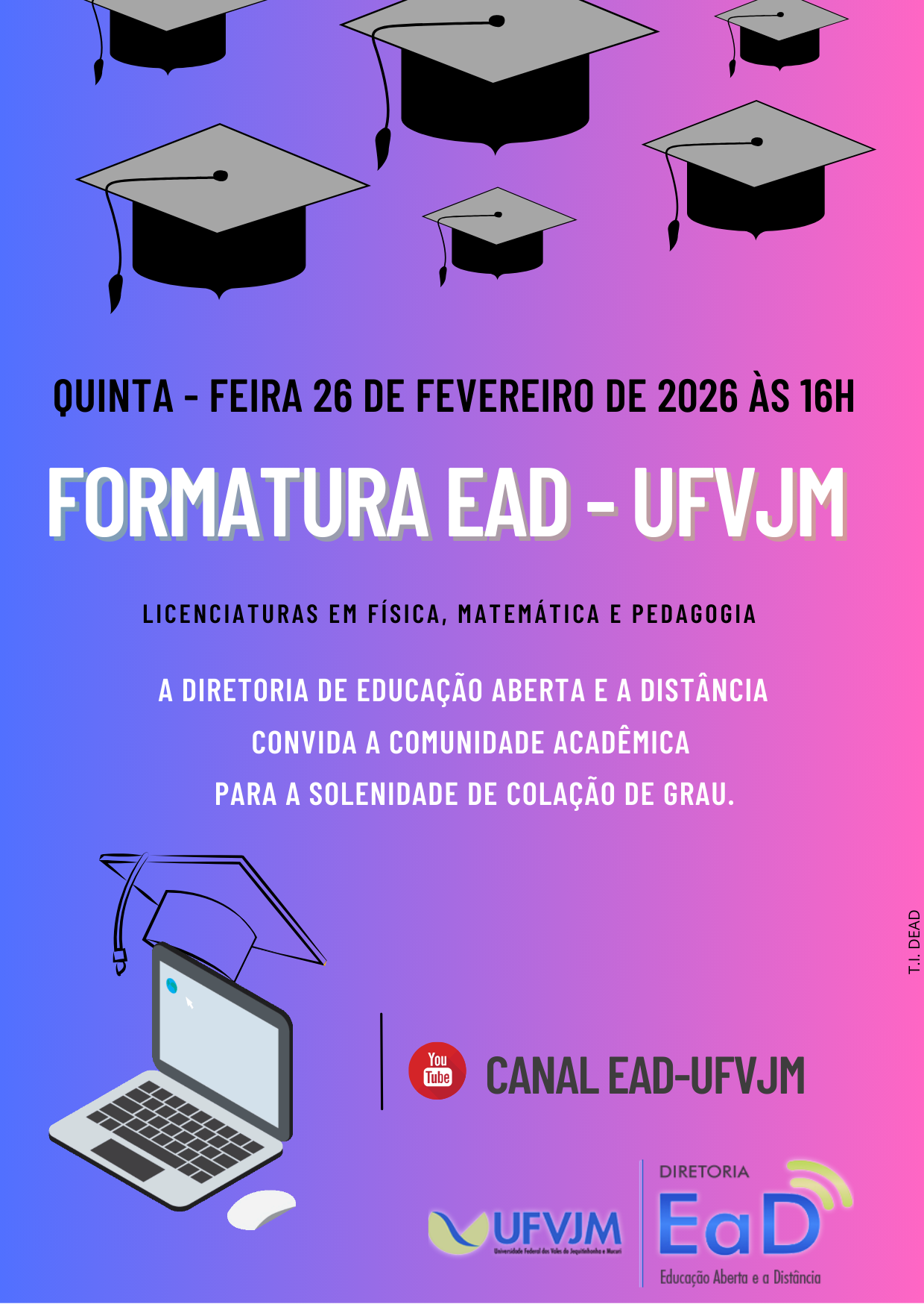 Será realizada no dia 26 de fevereiro de 2026 (quinta-feira), às 16h, a Solenidade de Colação de Grau dos cursos de Licenciatura em Física, Matemática e Pedagogia, ofertados na modalidade a distância pela UFVJM.